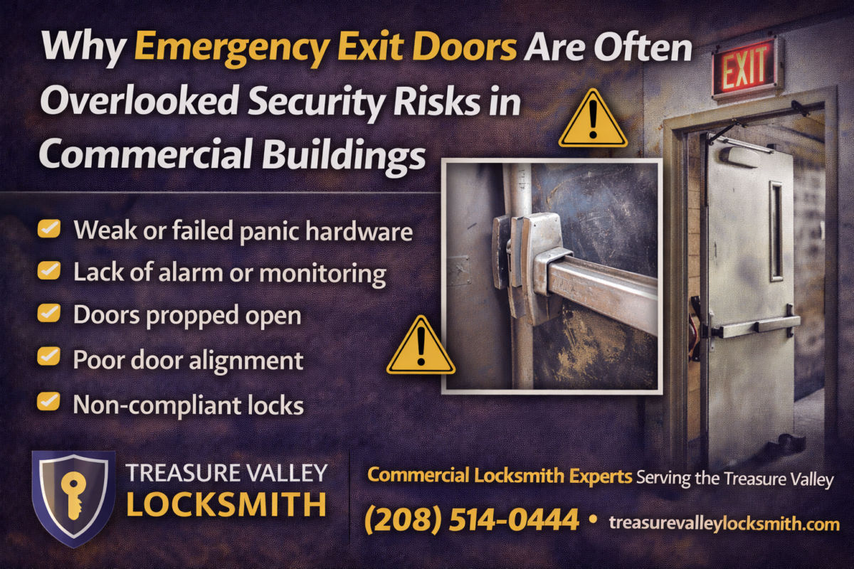 At Treasure Valley Locksmith, we frequently discover that emergency exit doors are the weakest point in an otherwise well-secured building. Understanding why these doors create security risks — and how to fix them — can help protect your business from theft, liability, and compliance issues.